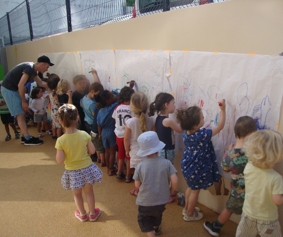 Avant la crise sanitaire, un rituel bien rodé prenait place pour les enfants. Toutes les deux semaines, chacun leur tour, ils partaient à l’aventure et trouvaient le bonheur au coin de la rue, l’école et la crèche étant presque voisines. Lorsqu’arrivait le tour de la crèche de se déplacer à l’école, nos bouts de chou profitaient de la salle de motricité et partageaient la récréation avec les élèves de la petite section. La fois suivante, à la crèche, petits et moins petits se réunissaient pour lire, chanter, jouer. Parfois même, des œuvres d’art voyaient le jour, comme avec la fresque de la cour de la crèche, réalisée par nos artistes en herbe il y a quelques années.